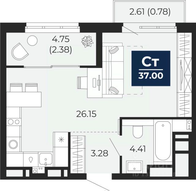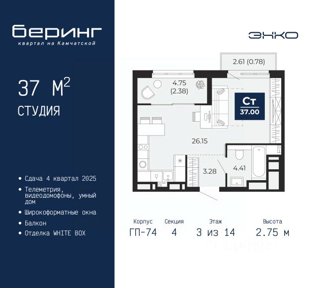 1-комн. квартира-студия от застройщика в ЖК "Беринг" на 8 этаже. Квартира без отделки, после оформления собственности можно делать ремонт. Общая площадь: 37.09 кв.м., площадь гостиной 26.57 кв.м., из которых 5 кв.м. выделено под кухонную зону. Все окна выходят на одну сторону. В квартире один балкон и одна лоджия, один совмещенный санузел. Высота потолков 2.75 м. Дом монолитный, многоподъездный, переменной этажности, от 9 до 21 этажей. Квартира находится в 3-й секции высотой 9 этажей в корпусе ГП-74. На этаже 7 квартир. В подъезде 1 грузовой лифт. Окончание строительства - 4 квартал 2025 года. Оформление сделки по договору долевого участия. Подобно знаменитому исследователю, мы чувствуем себя первооткрывателями этой локации. Хотим показать новую суть места, сформировать для вас жизненный опыт, которого ещё не было. Беринг — район зелёного цвета. Беринг — район, который откроется вам с другой стороны. Впечатлит новым уровнем комфорта и качеством жизни. Беринг — открытие на карте города. Первый квартал расположен в районе Тура, в границах улиц: Камчатская Западносибирская Энтузиастов. Вокруг уже есть всё для того, чтобы ежедневная рутина была лишь частью жизни и не доставляла дискомфорта. Школы и детские сады, магазины и аптеки, поликлиника, места для семейного отдыха, пеших и велопрогулок, и даже рыбалки. Масштабное озеленение дворов — визитная карточка ЭНКО и ваш оазис спокойствия, чтобы отвлечься от повседневности. Раскидистые деревья, кустарники, травы и цветы — осталось остановиться, вдохнуть и расслабиться, глядя на эту природную красоту. Стилистика подъездов продолжает концепцию Беринга, вдохновлённого Камчаткой: сдержанный, но при этом впечатляющий дизайн соседствует с удобством и функциональностью. #zMsFAb