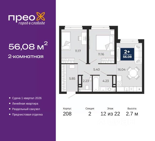 Торопитесь забронировать, пока действует скидка, срок акции ограничен! Стоимость квартиры указана со скидкой, ваша экономия составит 1,235,886 руб. Звоните, мы вам все подробно расскажем. 2-комн. квартира от застройщика с предчистовой отделкой в ЖК "Прео" на 12 этаже. Общая площадь: 56.08 кв.м., жилая: 22.33 кв.м., площадь просторной кухни-столовой: 16.04 кв.м. Комнаты изолированные, все окна выходят на одну сторону. В квартире один раздельный санузел. Высота потолков 2.7 м. Дом монолитный, трехподъездный, переменной этажности, от 14 до 22 этажей. Квартира находится во 2-й секции высотой 22 этажа в корпусе 208. На этаже 10 квартир. В подъезде 1 пассажирский и 1 грузовой лифт. Окончание строительства - 1 квартал 2026 года. Оформление сделки по договору долевого участия. Преображенский — один из самых привлекательных районов для жизни! Это полностью самостоятельный жилой район с точки зрения инфраструктуры. Преображенский находится между Московским и Червишевским трактами в квартале улиц Закалужская — Вьюжная — Александра Протозанова. Не нужно ждать, когда появится инфраструктура — переезжайте на всё готовое. Вблизи расположены действующие школа и детский сад. В этом году откроется еще один сад, а в следующем году — школа. По соседству с Преображенским запланировано строительство городского парка "Комарово" площадью 38 гектар. За 10 минут можно доехать на автомобиле до крупных ТРЦ: "Лента", "Кристалл", "Леруа Мерлен", "Метро" и "Ашан". С 2018 года в районе открыт Соседский центр — пространство, созданное для формирования добрососедской среды, совместного досуга, общения и реализации соседских инициатив. Здесь проходят встречи соседей, а также сами жители района организовывают мероприятия. Организатором такого события может стать любой желающий. В квартирах выполнена качественная предчистовая отделка. Гладкие стены с финишным выравниванием по маякам. Ровный потолок для установки натяжного потолка. Установлены пятикамерные окна с двойным стеклопакетом (3 стекла). Дизайнерские холлы с видеонаблюдением, безбарьерным и прозрачным входом всегда светло и спокойно. На первом этаже есть просторные колясочные, где все жители могут оставлять свои коляски и велосипеды. В Преображенском есть всё, что нужно для активного отдыха и занятий спортом. Мы сделали большое футбольное поле с безопасным покрытием. Также установили хоккейный корт, который оборудован по всем необходимым стандартам. Во дворах можно делать упражнения на специальных площадках с турниками. Весь район мы обустроили велодорожками, которые связаны в единый маршрут. У нас есть сухие фонтаны, бьющие из земли, деревья, веревки, сетки, скалодром, газон, песок и резинка — осталось просто дать своему ребенку право на свободную игру. По-настоящему хорошие дворы — это те, которые дети предпочитают соцсетям и телевизору. Аккредитация в банках: "Сбербанк России", ПАО "Банк Уралсиб", ПАО "Газпромбанк", ОАО "Альфа-Банк", ПАО Банк "ВТБ" и других. #ZmUOwg