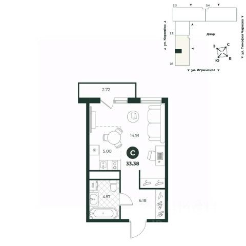 Просторная студия с французским балконом и видом во двор - отлично подойдет для молодой семьи. В комнате выделена зона под кухонный гарнитур. В прихожей достаточно места для размещения шкафа с верхней одеждой.