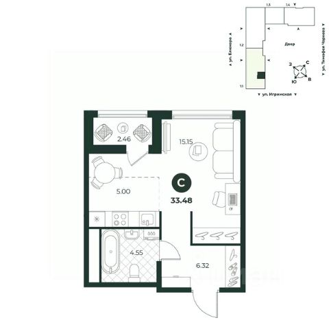 Просторная студия с французским балконом и видом во двор - отлично подойдет для молодой семьи. В комнате выделена зона под кухонный гарнитур. В прихожей достаточно места для размещения шкафа с верхней одеждой.