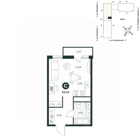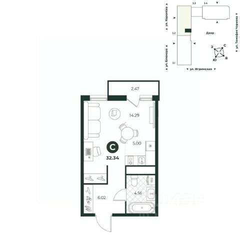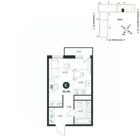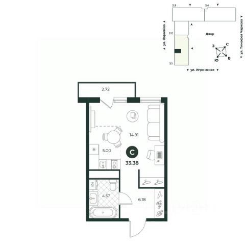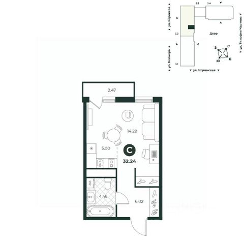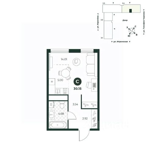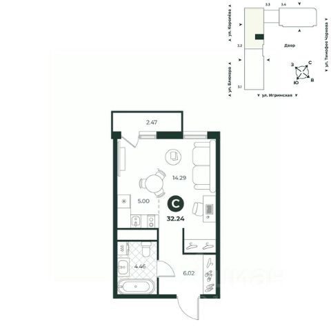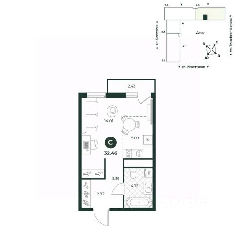 Просторная студия с грамотно организованной планировкой позволяет разместить полноценный кухонный гарнитур и оставляет достаточно свободного пространства для комфортного проживания.Окна квартиры выходят во двор.