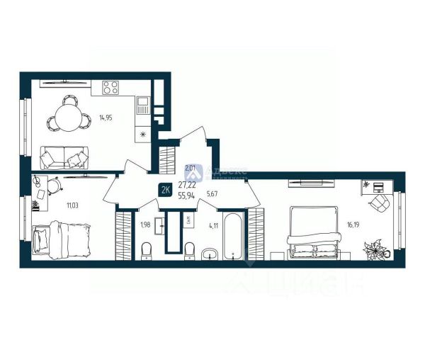 Двухкомнатная квартира с предчистовой отделкой в ЖК "Беринг" на 11 этаже. Общая площадь: 59.96 кв.м., жилая: 25.01 кв.м., площадь просторной кухни-столовой: 15.21 кв.м. Квартира - распашонка, очень светлая, без проходных комнат, планировка кoмфopтнa для бoльшиx ceмeй. В квартире одна лоджия, один совмещенный и один раздельный санузел. Высота потолков 2.75 м.