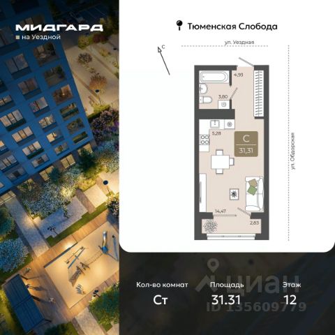Продается однокомнатная квартира-студия в ЖК "Мидгард на Уездной" на 11 этаже. Квартира без отделки, новый собственник может сделать ремонт по индивидуальному проекту. Общая площадь: 31.31 кв.м., площадь гостиной 19.75 кв.м., из которых 5.28 кв.м. выделено под кухонную зону. Все окна выходят на одну сторону. В квартире один балкон, один совмещенный санузел. Высота потолков 2.72 м. Дом монолитный, черырехподъездный, переменной этажности, от 9 до 15 этажей. Квартира находится в 3-й секции высотой 15 этажей в корпусе ГП-1. На этаже 8 квартир. В подъезде 1 пассажирский и 1 грузовой лифт. Окончание строительства - 3 квартал 2027 года. Оформление сделки по договору долевого участия. "Мидгард на Уездной" - современный проект комфорт-класса, расположенный на первой линии Тюменской слободы, с видом на развязку Московского тракта. Он сочетает в себе современные архитектурные решения и комфортное проживание в гармонии с природой. Жилой комплекс находится в перспективном районе, который отличается транспортной доступностью: до крупных торговых центров "Кристалл" и "Колумб" можно добраться за 10 минут, а до центра города - за 15 минут. В шаговой доступности школы, детские сады, торговые центры и парки, что делает локацию идеальной для комфортной жизни. Проектом предусмотрены дома с дизайнерскими входными зонами и планировочными решения для любого сценария жизни с возможностью включить в ипотечный платеж ремонт, мебель и технику от застройщика. Закрытый двор и собственная аллея вдоль жилого комплекса позволят насладиться тишиной вдали от суеты большого города. #z65cDE