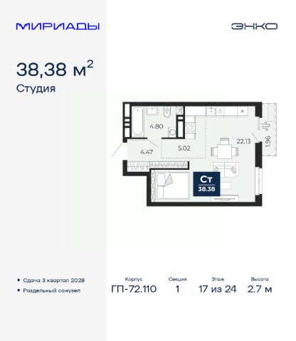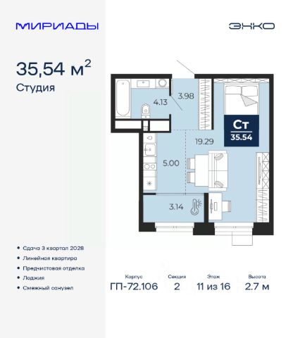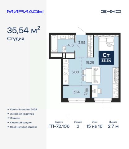 Однокомнатная квартира-студия с предчистовой отделкой в ЖК "Мириады" на 15 этаже. Общая площадь: 39.6 кв.м., площадь гостиной 34.8 кв.м., из которых 5.3 кв.м. выделено под кухонную зону. Все окна выходят на одну сторону. В квартире одна лоджия, один совмещенный санузел. Высота потолков 2.7 м. Дом монолитный, многоподъездный, переменной этажности, от 14 до 16 этажей. Квартира находится в 4-й секции высотой 16 этажей в корпусе ГП-72.102. На этаже 6 квартир. В подъезде 1 пассажирский и 1 грузовой лифт. Строительство окончено, дом сдан в 4 квартале 2025 года. Оформление сделки по договору купли-продажи. Вселенная бесконечных историй. Ранее невиданный Тюмени масштаб: территория 240 гектаров и 1 650 000 м² застройки. Мириады это город масштабных перемен и больших возможностей. Город зеленых рощ и зеркальных озер. Город для работы, учебы и развлечений. Город для детей и их родителей. Город для всех и каждого. Проект расположен в районе Мыс рядом с ТРЦ "Тюмень Сити Молл" в границах улицы Тимофея Чаркова, Тобольского тракта и объездной дороги. Срок полного освоения территории - до 2034 года. #2MDE5M