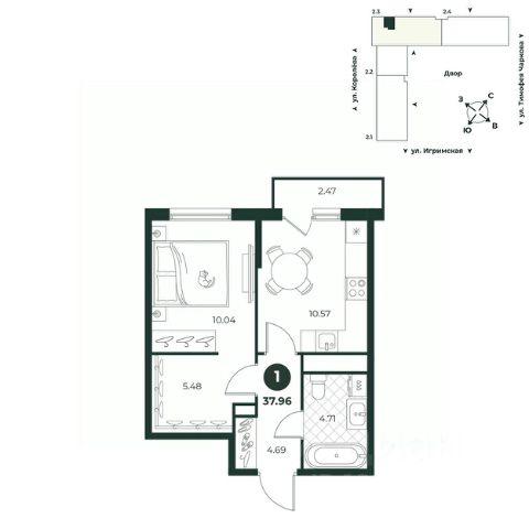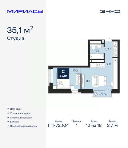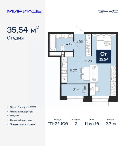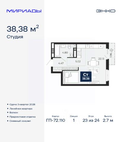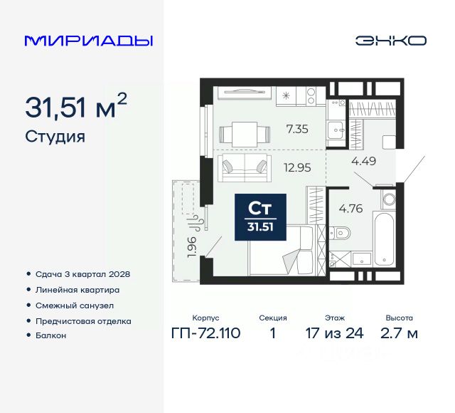 Продается однокомнатная квартира-студия с предчистовой отделкой в ЖК "Мириады" на 4 этаже. Общая площадь: 31.03 кв.м., площадь гостиной 20.3 кв.м., из которых 7.35 кв.м. выделено под кухонную зону. Все окна выходят на одну сторону. В квартире один балкон, один совмещенный санузел. Высота потолков 2.7 м. Квартира находится в корпусе ГП-72.110. Дом монолитный, одноподъездный, высотой 24 этажа. На этаже 8 квартир. В подъезде 2 пассажирских и 1 грузовой лифт. Начало строительства - 1 квартал 2026 года. Окончание строительства - 3 квартал 2028 года. Оформление сделки по договору долевого участия. Вселенная бесконечных историй. Ранее невиданный Тюмени масштаб: территория 240 гектаров и 1 650 000 м² застройки. Мириады это город масштабных перемен и больших возможностей. Город зеленых рощ и зеркальных озер. Город для работы, учебы и развлечений. Город для детей и их родителей. Город для всех и каждого. Проект расположен в районе Мыс рядом с ТРЦ "Тюмень Сити Молл" в границах улицы Тимофея Чаркова, Тобольского тракта и объездной дороги. Срок полного освоения территории - до 2034 года. #2mddg3