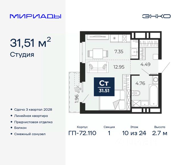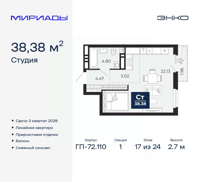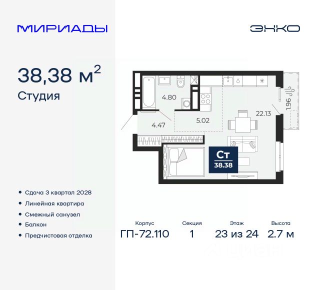 Однокомнатная квартира-студия от застройщика с предчистовой отделкой в ЖК "Мириады" на 3 этаже. Общая площадь: 28.2 кв.м., площадь гостиной 19.2 кв.м., из которых 5 кв.м. выделено под кухонную зону. Все окна выходят на одну сторону. В квартире один балкон, один совмещенный санузел. Высота потолков 2.7 м. Дом монолитный, трехподъездный, переменной этажности, от 14 до 16 этажей. Квартира находится во 2-й секции высотой 16 этажей в корпусе ГП-72.103. На этаже 6 квартир. В подъезде 1 пассажирский и 1 грузовой лифт. Строительство завершено, дом сдан в 4 квартале 2025 года. Оформление сделки по договору купли-продажи. Вселенная бесконечных историй. Ранее невиданный Тюмени масштаб: территория 240 гектаров и 1 650 000 м² застройки. Мириады это город масштабных перемен и больших возможностей. Город зеленых рощ и зеркальных озер. Город для работы, учебы и развлечений. Город для детей и их родителей. Город для всех и каждого. Проект расположен в районе Мыс рядом с ТРЦ "Тюмень Сити Молл" в границах улицы Тимофея Чаркова, Тобольского тракта и объездной дороги. Срок полного освоения территории - до 2034 года. #Z7O20g