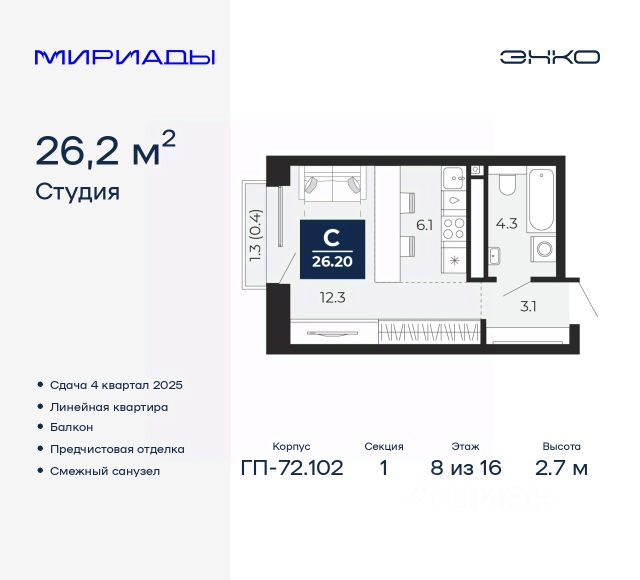 1-комн. квартира-студия с предчистовой отделкой в ЖК "Мириады" на 10 этаже. Общая площадь: 26.2 кв.м., площадь гостиной 18.4 кв.м., из которых 6.1 кв.м. выделено под кухонную зону. Все окна выходят на одну сторону. В квартире один балкон, один совмещенный санузел. Высота потолков 2.7 м. Дом монолитный, многоподъездный, переменной этажности, от 14 до 16 этажей. Квартира находится в 1-й секции высотой 16 этажей в корпусе ГП-72.102. На этаже 9 квартир. В подъезде 1 пассажирский и 1 грузовой лифт. Окончание строительства - 4 квартал 2025 года. Оформление сделки по договору долевого участия. Вселенная бесконечных историй. Ранее невиданный Тюмени масштаб: территория 240 гектаров и 1 650 000 м² застройки. Мириады это город масштабных перемен и больших возможностей. Город зеленых рощ и зеркальных озер. Город для работы, учебы и развлечений. Город для детей и их родителей. Город для всех и каждого. Проект расположен в районе Мыс рядом с ТРЦ "Тюмень Сити Молл" в границах улицы Тимофея Чаркова, Тобольского тракта и объездной дороги. Срок полного освоения территории - до 2034 года. #z6vegF