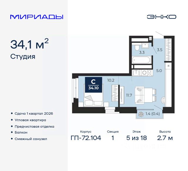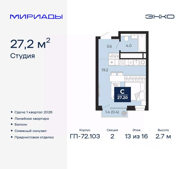 1-комн. квартира-студия от застройщика с предчистовой отделкой в ЖК "Мириады" на 23 этаже. Общая площадь: 32.4 кв.м., площадь гостиной 23.7 кв.м., из которых 7.7 кв.м. выделено под кухонную зону. Все окна выходят на одну сторону. В квартире одна лоджия, один совмещенный санузел. Высота потолков 2.7 м. Квартира находится в корпусе ГП-72.101. Дом монолитный, одноподъездный, высотой 25 этажей. На этаже 8 квартир. В подъезде 2 пассажирских и 1 грузовой лифт. Окончание строительства - 1 квартал 2026 года. Оформление сделки по договору долевого участия. Вселенная бесконечных историй. Ранее невиданный Тюмени масштаб: территория 240 гектаров и 1 650 000 м² застройки. Мириады это город масштабных перемен и больших возможностей. Город зеленых рощ и зеркальных озер. Город для работы, учебы и развлечений. Город для детей и их родителей. Город для всех и каждого. Проект расположен в районе Мыс рядом с ТРЦ "Тюмень Сити Молл" в границах улицы Тимофея Чаркова, Тобольского тракта и объездной дороги. Срок полного освоения территории - до 2034 года. #zMTdgb