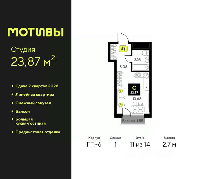 1-комн. квартира-студия с предчистовой отделкой в ЖК "Мотивы" на 2 этаже. Общая площадь: 21.91 кв.м., площадь гостиной 13.21 кв.м., из которых 5 кв.м. выделено под кухонную зону. Все окна выходят на одну сторону. В квартире один балкон, один совмещенный санузел. Высота потолков 2.7 м. Квартира будет сдаваться с предчистовой отделкой White Box: выровнены и оштукатурены стены, проведено электричество и отопление, установлены радиаторы. Вы также можете приобрести квартиру с ремонтом от застройщика, представленным в трех цветовых решениях Scandi, Wood и Coffee и включающим ламинат, обои под покраску, двери, натяжной потолок и санузел с сантехникой. При желании вы можете заказать отделку под ключ, варианты возможных решений представлены в альбоме фотографий. Дом монолитный, черырехподъездный, переменной этажности, от 12 до 14 этажей. Квартира находится в 6-й секции высотой 14 этажей в корпусе ГП-8. На этаже 12 квартир. В подъезде 1 пассажирский и 1 грузовой лифт. Окончание строительства - 2 квартал 2026 года. Оформление сделки по договору долевого участия. Закрытая от автомобилей территория, безопасный двор и камеры видеонаблюдения - гаранты вашего спокойствия. Квартал будет располагать богатой инфраструктурой: на первых этажах разместятся магазины, пекарни, кофейни, пункты выдачи, аптеки, детские центры, цветочные салоны и многое другое, что сделает жизнь поистине комфортной. Рядом находится парк общей площадью почти 5000 м², в котором располагаются локации для игр и отдыха жителей, здесь можно совершить утреннюю пробежку или прогуляться после рабочего дня. В парке есть зона воркаута с тренажерами для взрослых, игровые комплексы с горками и канатный комплекс для детей разных возрастов, качели и лавочки для отдыха, площадки для командных видов спорта и для панна-футбола. В ЖК "Мотивы" всё продумано до мелочей: светлые холлы входных групп, оформленные в едином стиле, просторные колясочные, лапомойки для питомцев. На территории комплекса находятся 2 8-ми этажных паркинга и более 1000 м/м на открытой парковке. Жилой комплекс находится в одном из экологически благоприятных районов Тюмени, недалеко от Плехановского бора. При этом до центра города можно добраться за 15 минут, а до международного аэропорта Рощино за 13 минут. Окончание строительства: ГП 1, 2, 3, 4 сдача до конца 2024 года, ГП 6, 7, 8 сдача 2 квартал 2026 года. #Z4Dba3