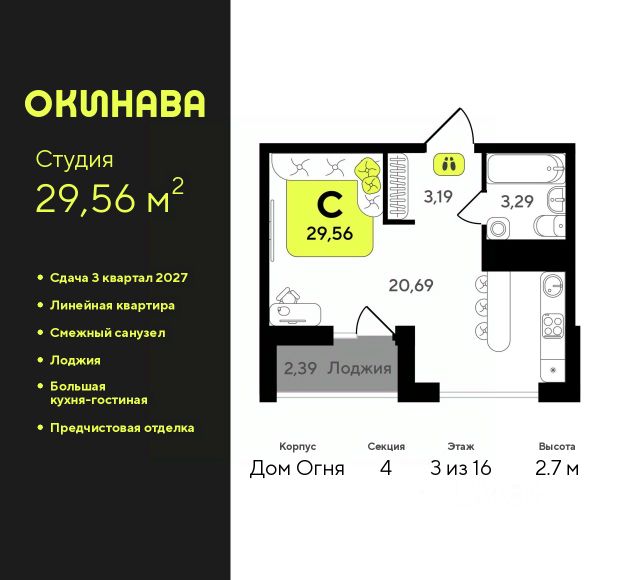 Просторная однокомнатная квартира-студия с предчистовой отделкой в ЖК "Окинава" на 16 этаже. Общая площадь: 24.32 кв.м., площадь гостиной 13.67 кв.м., из которых 5 кв.м. выделено под кухонную зону. Все окна выходят на одну сторону. В квартире один балкон, один совмещенный санузел. Высота потолков 2.7 м. Квартира будет сдана с предчистовой отделкой: на полах стяжка под финишное покрытие, стены подготовлены под покраску или оклейку обоями, разведена вся электрика с подготовкой для установки выключателей и освещения. При желании вы можете заказать отделку под ключ, варианты возможных решений представлены в альбоме фотографий. Дом монолитный, многоподъездный, переменной этажности, от 13 до 19 этажей. Квартира находится в 6-й секции высотой 19 этажей в корпусе Дом Огня. На этаже 12 квартир. В подъезде 2 пассажирских и 1 грузовой лифт. Окончание строительства - 3 квартал 2027 года. Оформление сделки по договору долевого участия. ЖК "Окинава" это не просто жилой комплекс, это остров 4 стихий. Они отражаются во внешнем виде фасадов домов, обустройстве дворов и внутреннем оформлении холлов. Каждая из стихий это отдельный дом. Между домами раскинется большой двухуровневый пешеходный бульвар. Первый уровень прогулочный с местами для отдыха, амфитеатром и фонтанами. На втором уровне расположатся площадки для детей, спортивных игр и тренировок. Квартал будет располагать богатой инфраструктурой: на первых этажах разместятся магазины, пекарни, кофейни, пункты выдачи, аптеки, детские центры, цветочные салоны и многое другое, что сделает жизнь поистине комфортной. В жилом комплексе есть кладовые, а также несколько видов паркинга: уличный гостевой, закрытый теплый и паркинг в стилобате, попасть в который можно на лифте с любого жилого этажа. Дворы в каждом доме отражают его стихию, отличаясь по наполнению. Они дополняют друг друга, образуя единое дворовое пространство жилого комплекса. Закрытая территория, свободная от автомобилей, обеспечит безопасность и спокойный отдых. Холлы оформлены керамогранитом, зеркалами и разноуровневым освещением. Витражные входные группы, мягкие зоны ожидания, видеонаблюдение 24/7, вместительные колясочные и даже лапомойки для питомцев всё это будет в ЖК "Окинава". Жилой комплекс "Окинава" находится в активно развивающемся V заречном микрорайоне, недалеко от озера Алебашево, где в будущем расположится масштабный ивент-парк с зонами отдыха. Удобная транспортная развязка позволит добраться до центра всего за 15 минут. #z4EiWz