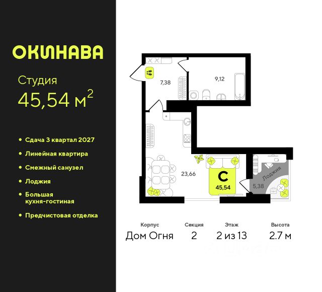 Однокомнатная квартира-студия с предчистовой отделкой в ЖК "Окинава" на 2 этаже. Общая площадь: 45.54 кв.м., площадь гостиной 23.66 кв.м., из которых 5 кв.м. выделено под кухонную зону. Все окна выходят на одну сторону. В квартире одна лоджия, один совмещенный санузел. Высота потолков 2.7 м. Квартира будет сдана с предчистовой отделкой: на полах стяжка под финишное покрытие, стены подготовлены под покраску или оклейку обоями, разведена вся электрика с подготовкой для установки выключателей и освещения. При желании вы можете заказать отделку под ключ, варианты возможных решений представлены в альбоме фотографий. Дом монолитный, многоподъездный, переменной этажности, от 13 до 19 этажей. Квартира находится во 2-й секции высотой 13 этажей в корпусе Дом Огня. На этаже 5 квартир. В подъезде 1 пассажирский и 1 грузовой лифт. Окончание строительства - 3 квартал 2027 года. Оформление сделки по договору долевого участия. ЖК "Окинава" это не просто жилой комплекс, это остров 4 стихий. Они отражаются во внешнем виде фасадов домов, обустройстве дворов и внутреннем оформлении холлов. Каждая из стихий это отдельный дом. Между домами раскинется большой двухуровневый пешеходный бульвар. Первый уровень прогулочный с местами для отдыха, амфитеатром и фонтанами. На втором уровне расположатся площадки для детей, спортивных игр и тренировок. Квартал будет располагать богатой инфраструктурой: на первых этажах разместятся магазины, пекарни, кофейни, пункты выдачи, аптеки, детские центры, цветочные салоны и многое другое, что сделает жизнь поистине комфортной. В жилом комплексе есть кладовые, а также несколько видов паркинга: уличный гостевой, закрытый теплый и паркинг в стилобате, попасть в который можно на лифте с любого жилого этажа. Дворы в каждом доме отражают его стихию, отличаясь по наполнению. Они дополняют друг друга, образуя единое дворовое пространство жилого комплекса. Закрытая территория, свободная от автомобилей, обеспечит безопасность и спокойный отдых. Холлы оформлены керамогранитом, зеркалами и разноуровневым освещением. Витражные входные группы, мягкие зоны ожидания, видеонаблюдение 24/7, вместительные колясочные и даже лапомойки для питомцев всё это будет в ЖК "Окинава". Жилой комплекс "Окинава" находится в активно развивающемся V заречном микрорайоне, недалеко от озера Алебашево, где в будущем расположится масштабный ивент-парк с зонами отдыха. Удобная транспортная развязка позволит добраться до центра всего за 15 минут. #z4eIEc