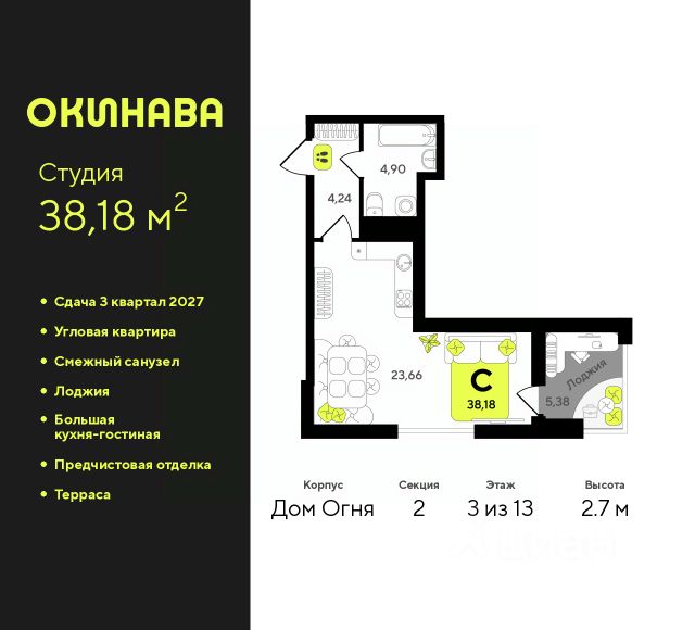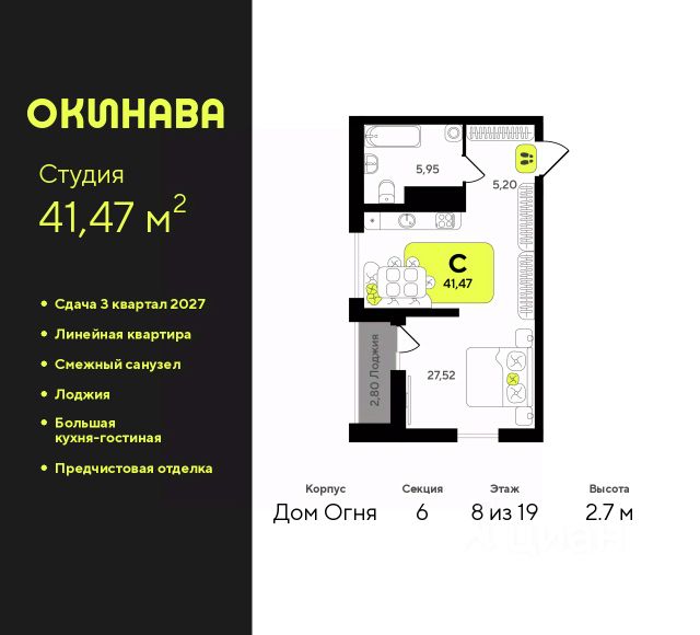 1-комн. квартира-студия с предчистовой отделкой в ЖК "Окинава" на 18 этаже. Общая площадь: 41.47 кв.м., площадь гостиной 27.52 кв.м., из которых 5 кв.м. выделено под кухонную зону. Все окна выходят на одну сторону. В квартире одна лоджия, один совмещенный санузел. Высота потолков 2.7 м. Квартира будет сдана с предчистовой отделкой: на полах стяжка под финишное покрытие, стены подготовлены под покраску или оклейку обоями, разведена вся электрика с подготовкой для установки выключателей и освещения. При желании вы можете заказать отделку под ключ, варианты возможных решений представлены в альбоме фотографий. Дом монолитный, многоподъездный, переменной этажности, от 13 до 19 этажей. Квартира находится в 6-й секции высотой 19 этажей в корпусе Дом Огня. На этаже 12 квартир. В подъезде 2 пассажирских и 1 грузовой лифт. Окончание строительства - 3 квартал 2027 года. Оформление сделки по договору долевого участия. ЖК "Окинава" это не просто жилой комплекс, это остров 4 стихий. Они отражаются во внешнем виде фасадов домов, обустройстве дворов и внутреннем оформлении холлов. Каждая из стихий это отдельный дом. Между домами раскинется большой двухуровневый пешеходный бульвар. Первый уровень прогулочный с местами для отдыха, амфитеатром и фонтанами. На втором уровне расположатся площадки для детей, спортивных игр и тренировок. Квартал будет располагать богатой инфраструктурой: на первых этажах разместятся магазины, пекарни, кофейни, пункты выдачи, аптеки, детские центры, цветочные салоны и многое другое, что сделает жизнь поистине комфортной. В жилом комплексе есть кладовые, а также несколько видов паркинга: уличный гостевой, закрытый теплый и паркинг в стилобате, попасть в который можно на лифте с любого жилого этажа. Дворы в каждом доме отражают его стихию, отличаясь по наполнению. Они дополняют друг друга, образуя единое дворовое пространство жилого комплекса. Закрытая территория, свободная от автомобилей, обеспечит безопасность и спокойный отдых. Холлы оформлены керамогранитом, зеркалами и разноуровневым освещением. Витражные входные группы, мягкие зоны ожидания, видеонаблюдение 24/7, вместительные колясочные и даже лапомойки для питомцев всё это будет в ЖК "Окинава". Жилой комплекс "Окинава" находится в активно развивающемся V заречном микрорайоне, недалеко от озера Алебашево, где в будущем расположится масштабный ивент-парк с зонами отдыха. Удобная транспортная развязка позволит добраться до центра всего за 15 минут. #zWeIfU