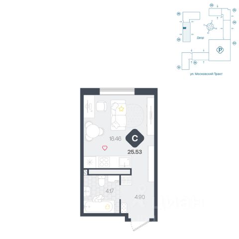 Уютная студия с большой ванной комнатой и прихожей, в которой поместится вместительный шкаф. Подойдет для студентов и свободных молодых людей.
