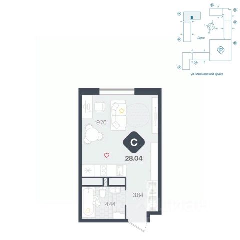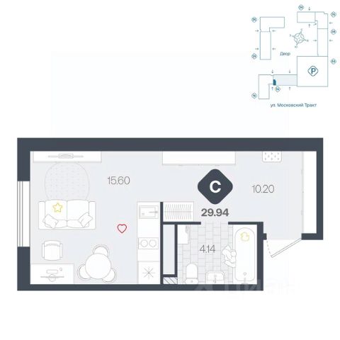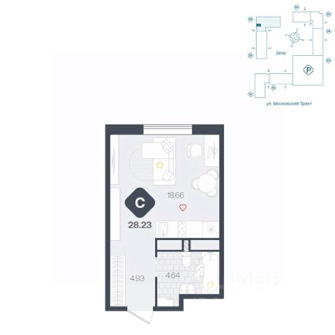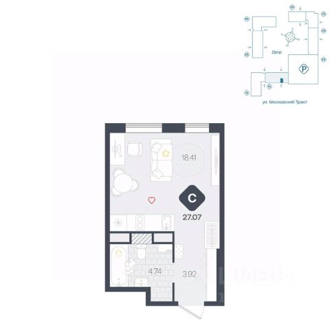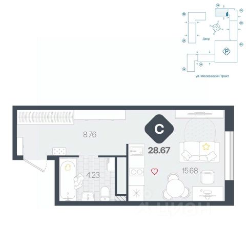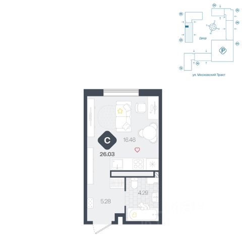 Вместительная студия с большой ванной комнатой и прихожей. В комнате предусмотрено грамотное зонирование на нишу и обеденную зону, а также на гостевую, которая легко трансформируется в спальню.
