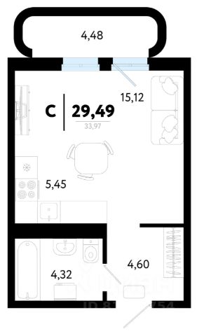 и спальное место, что позволяет эффективно использовать пространство. В прихожей оборудована ниша под шкаф-купе, в санузле предусмотрено место для стиральной машины.Дополнительное преимущество — есть балкон