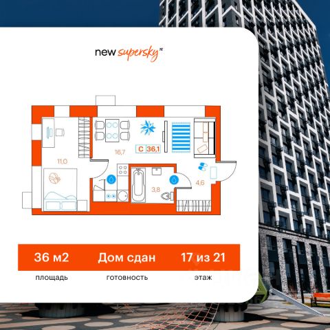 Студия с видовыми характеристиками, в современном жилом комплексе "New Supersky" — это функциональное пространство для жизни или инвестиций. Квартира сдается с улучшенной черновой отделкой, что позволяет сделать ремонт под индивидуальные потребности. Объект расположен в центральном округе Тюмени на пересечении улиц Ветеранов Труда и Ватутина, в 15 минутах езды от делового центра города.