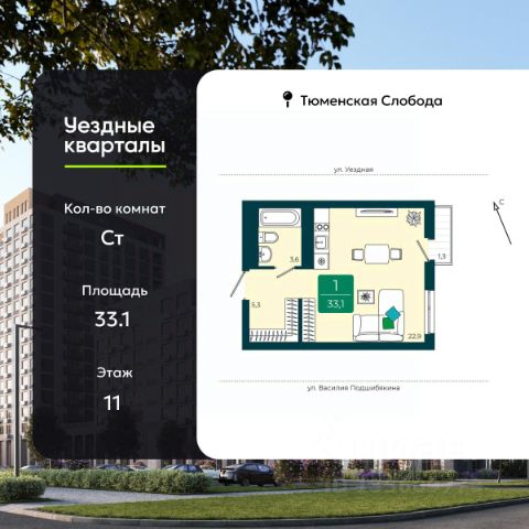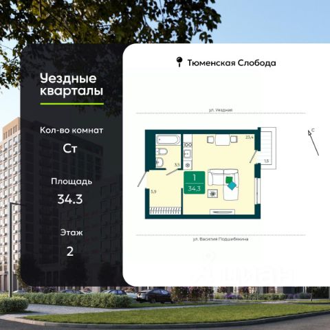 Однокомнатная квартира-студия с предчистовой отделкой в ЖК "Уездные кварталы" на 8 этаже. Общая площадь: 34.3 кв.м., площадь гостиной 23.4 кв.м., из которых 5 кв.м. выделено под кухонную зону. Все окна выходят на одну сторону. В квартире один балкон, один совмещенный санузел. Высота потолков 2.72 м. Дом монолитный, двухподъездный, переменной этажности, от 9 до 17 этажей. Квартира находится во 2-й секции высотой 9 этажей в корпусе ГП-5.1. На этаже 7 квартир. В подъезде 1 грузовой лифт. Окончание строительства - 4 квартал 2026 года. Оформление сделки по договору долевого участия. "Уездные кварталы" - семейный жилой комплекс комфорт-класса с авторской архитектурой и трехуровневым ландшафтным озеленением. Рядом расположены крупные транспортные развязки, которые позволяют добраться в любую точку города за 15 минут. Жилой комплекс находится в современном районе с развитой инфраструктурой, на первой линии Тюменской Слободы. Вокруг есть всё необходимое в шаговой доступности: новые детские сады и школы, остановки общественного транспорта, магазины, кафе и рестораны, поликлиника, детская школа искусств, парки и спортивный комплекс. На первых этажах квартала расположена собственная коммерческая сеть, а также свой соседский центр. Проект включает 5 домов переменной этажности с более чем 100 планировками - с террасами, французскими балконами и мастер-спальнями. Закрытые дворы оборудованы интерактивными площадками для игр, спортивными зонами и местами тихого отдыха. Вдоль жилого комплекса расположен пешеходный бульвар с сухим фонтаном, а для автомобилей предусмотрен теплый паркинг. Часть квартир можно приобрести с ремонтом, мебелью и техникой от застройщика, а расходы включить в ипотечный платеж.