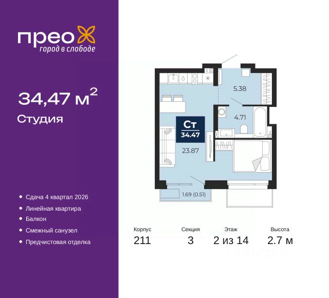 1-комн. квартира-студия с предчистовой отделкой в ЖК "Прео" на 12 этаже. Общая площадь: 32.77 кв.м., площадь гостиной 21.92 кв.м., из которых 10 кв.м. выделено под кухонную зону. Все окна выходят на одну сторону. В квартире один совмещенный санузел. Высота потолков 2.7 м. Дом монолитный, черырехподъездный, переменной этажности, от 14 до 21 этажей. Квартира находится в 1-й секции высотой 21 этаж в корпусе 211. На этаже 8 квартир. В подъезде 1 пассажирский и 1 грузовой лифт. Окончание строительства - 4 квартал 2026 года. Оформление сделки по договору долевого участия. Преображенский — один из самых привлекательных районов для жизни! Это полностью самостоятельный жилой район с точки зрения инфраструктуры. Преображенский находится между Московским и Червишевским трактами в квартале улиц Закалужская — Вьюжная — Александра Протозанова. Не нужно ждать, когда появится инфраструктура — переезжайте на всё готовое. Вблизи расположены действующие школа и детский сад. В этом году откроется еще один сад, а в следующем году — школа. По соседству с Преображенским запланировано строительство городского парка "Комарово" площадью 38 гектар. За 10 минут можно доехать на автомобиле до крупных ТРЦ: "Лента", "Кристалл", "Леруа Мерлен", "Метро" и "Ашан". С 2018 года в районе открыт Соседский центр — пространство, созданное для формирования добрососедской среды, совместного досуга, общения и реализации соседских инициатив. Здесь проходят встречи соседей, а также сами жители района организовывают мероприятия. Организатором такого события может стать любой желающий. В квартирах выполнена качественная предчистовая отделка. Гладкие стены с финишным выравниванием по маякам. Ровный потолок для установки натяжного потолка. Установлены пятикамерные окна с двойным стеклопакетом (3 стекла). Дизайнерские холлы с видеонаблюдением, безбарьерным и прозрачным входом всегда светло и спокойно. На первом этаже есть просторные колясочные, где все жители могут оставлять свои коляски и велосипеды. В Преображенском есть всё, что нужно для активного отдыха и занятий спортом. Мы сделали большое футбольное поле с безопасным покрытием. Также установили хоккейный корт, который оборудован по всем необходимым стандартам. Во дворах можно делать упражнения на специальных площадках с турниками. Весь район мы обустроили велодорожками, которые связаны в единый маршрут. У нас есть сухие фонтаны, бьющие из земли, деревья, веревки, сетки, скалодром, газон, песок и резинка — осталось просто дать своему ребенку право на свободную игру. По-настоящему хорошие дворы — это те, которые дети предпочитают соцсетям и телевизору. Аккредитация в банках: ПАО "Газпромбанк", "Сбербанк России", ПАО Банк "ВТБ", ПАО "Банк Уралсиб", ОАО "Альфа-Банк" и других. #2SOAWb