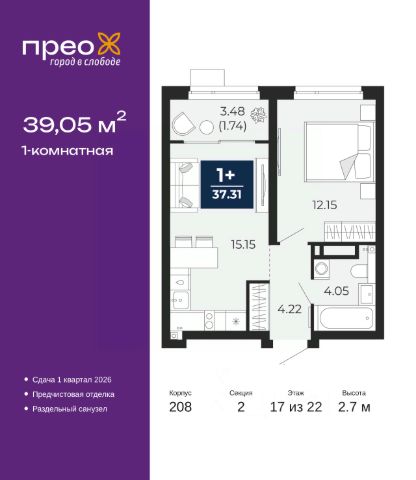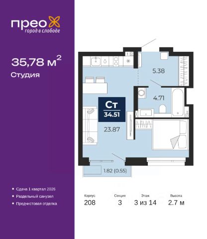 Спешите оформить бронирование на этих условиях, предложение ограничено! Стоимость квартиры указана со скидкой, ваша экономия составит 460,000 руб. По всем вопросам обращайтесь в офис продаж, наши менеджеры вам все расскажут. 1-комн. квартира-студия с предчистовой отделкой в ЖК "Прео" на 2 этаже. Общая площадь: 26.66 кв.м., площадь гостиной 16.58 кв.м., из которых 5 кв.м. выделено под кухонную зону. Все окна выходят на одну сторону. В квартире один совмещенный санузел. Высота потолков 2.7 м. Квартира находится в корпусе 204. Дом монолитный, одноподъездный, высотой 24 этажа. На этаже 14 квартир. В подъезде 2 грузовых лифта. Строительство завершено, дом сдан в 4 квартале 2024 года. Оформление сделки по договору купли-продажи. Преображенский — один из самых привлекательных районов для жизни! Это полностью самостоятельный жилой район с точки зрения инфраструктуры. Преображенский находится между Московским и Червишевским трактами в квартале улиц Закалужская — Вьюжная — Александра Протозанова. Не нужно ждать, когда появится инфраструктура — переезжайте на всё готовое. Вблизи расположены действующие школа и детский сад. В этом году откроется еще один сад, а в следующем году — школа. По соседству с Преображенским запланировано строительство городского парка "Комарово" площадью 38 гектар. За 10 минут можно доехать на автомобиле до крупных ТРЦ: "Лента", "Кристалл", "Леруа Мерлен", "Метро" и "Ашан". С 2018 года в районе открыт Соседский центр — пространство, созданное для формирования добрососедской среды, совместного досуга, общения и реализации соседских инициатив. Здесь проходят встречи соседей, а также сами жители района организовывают мероприятия. Организатором такого события может стать любой желающий. В квартирах выполнена качественная предчистовая отделка. Гладкие стены с финишным выравниванием по маякам. Ровный потолок для установки натяжного потолка. Установлены пятикамерные окна с двойным стеклопакетом (3 стекла). Дизайнерские холлы с видеонаблюдением, безбарьерным и прозрачным входом всегда светло и спокойно. На первом этаже есть просторные колясочные, где все жители могут оставлять свои коляски и велосипеды. В Преображенском есть всё, что нужно для активного отдыха и занятий спортом. Мы сделали большое футбольное поле с безопасным покрытием. Также установили хоккейный корт, который оборудован по всем необходимым стандартам. Во дворах можно делать упражнения на специальных площадках с турниками. Весь район мы обустроили велодорожками, которые связаны в единый маршрут. У нас есть сухие фонтаны, бьющие из земли, деревья, веревки, сетки, скалодром, газон, песок и резинка — осталось просто дать своему ребенку право на свободную игру. По-настоящему хорошие дворы — это те, которые дети предпочитают соцсетям и телевизору. Аккредитация в банках: "Сбербанк России", ПАО Банк "ВТБ", ОАО "Альфа-Банк", ПАО "Газпромбанк", ПАО "Банк Уралсиб" и других. #zzc3DW