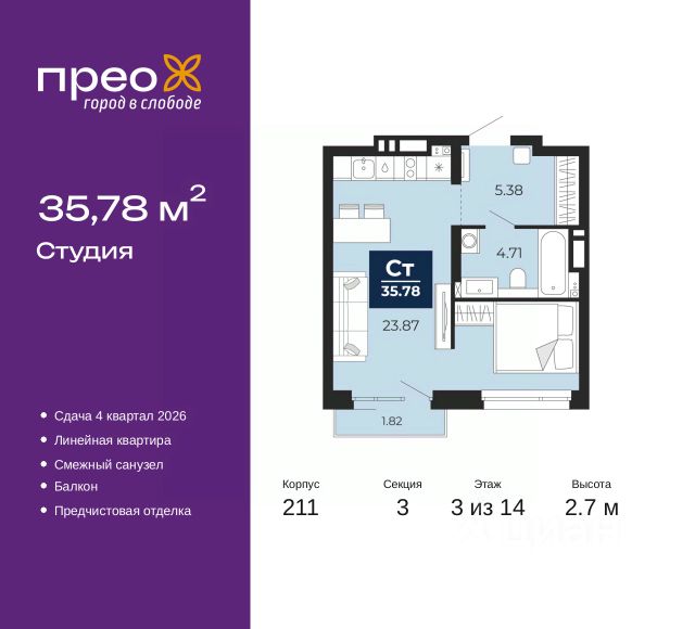 Торопитесь забронировать, пока действует скидка, предложение ограничено! Стоимость квартиры указана со скидкой, ваша экономия составит 823,500 руб. Информация по телефону, наши менеджеры вам все расскажут. Просторная 1-комн. квартира-студия с предчистовой отделкой в ЖК "Прео" на 7 этаже. Общая площадь: 32.77 кв.м., площадь гостиной 21.92 кв.м., из которых 10 кв.м. выделено под кухонную зону. Все окна выходят на одну сторону. В квартире один совмещенный санузел. Высота потолков 2.7 м. Дом монолитный, черырехподъездный, переменной этажности, от 14 до 21 этажей. Квартира находится в 1-й секции высотой 21 этаж в корпусе 211. На этаже 8 квартир. В подъезде 1 пассажирский и 1 грузовой лифт. Окончание строительства - 4 квартал 2026 года. Оформление сделки по договору долевого участия. Преображенский — один из самых привлекательных районов для жизни! Это полностью самостоятельный жилой район с точки зрения инфраструктуры. Преображенский находится между Московским и Червишевским трактами в квартале улиц Закалужская — Вьюжная — Александра Протозанова. Не нужно ждать, когда появится инфраструктура — переезжайте на всё готовое. Вблизи расположены действующие школа и детский сад. В этом году откроется еще один сад, а в следующем году — школа. По соседству с Преображенским запланировано строительство городского парка "Комарово" площадью 38 гектар. За 10 минут можно доехать на автомобиле до крупных ТРЦ: "Лента", "Кристалл", "Леруа Мерлен", "Метро" и "Ашан". С 2018 года в районе открыт Соседский центр — пространство, созданное для формирования добрососедской среды, совместного досуга, общения и реализации соседских инициатив. Здесь проходят встречи соседей, а также сами жители района организовывают мероприятия. Организатором такого события может стать любой желающий. В квартирах выполнена качественная предчистовая отделка. Гладкие стены с финишным выравниванием по маякам. Ровный потолок для установки натяжного потолка. Установлены пятикамерные окна с двойным стеклопакетом (3 стекла). Дизайнерские холлы с видеонаблюдением, безбарьерным и прозрачным входом всегда светло и спокойно. На первом этаже есть просторные колясочные, где все жители могут оставлять свои коляски и велосипеды. В Преображенском есть всё, что нужно для активного отдыха и занятий спортом. Мы сделали большое футбольное поле с безопасным покрытием. Также установили хоккейный корт, который оборудован по всем необходимым стандартам. Во дворах можно делать упражнения на специальных площадках с турниками. Весь район мы обустроили велодорожками, которые связаны в единый маршрут. У нас есть сухие фонтаны, бьющие из земли, деревья, веревки, сетки, скалодром, газон, песок и резинка — осталось просто дать своему ребенку право на свободную игру. По-настоящему хорошие дворы — это те, которые дети предпочитают соцсетям и телевизору. Аккредитация в банках: ПАО "Газпромбанк", ПАО "Банк Уралсиб", ОАО "Альфа-Банк", "Сбербанк России", ПАО Банк "ВТБ" и других. #2t0bgb
