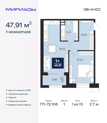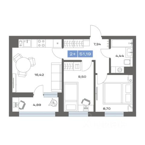 Успейте забронировать по этой цене! Срок предложения ограничен! Стоимость квартиры указана со скидкой, ваша экономия составит 392,000 RUB. Звоните, наши менеджеры вам все расскажут! Продается двухкомнатная квартира от застройщика с предчистовой отделкой в ЖК "Мириады" на 13 этаже. Общая площадь: 57.22 кв.м., жилая: 21.99 кв.м., площадь просторной кухни-столовой: 16.14 кв.м. Комнаты изолированные, все окна выходят на одну сторону. В квартире два балкона, два совмещенных санузла. Высота потолков 2.7 м. Дом монолитный, двухподъездный, переменной этажности, от 14 до 16 этажей. Квартира находится в 1-й секции высотой 14 этажей в корпусе ГП-72.107. На этаже 5 квартир. В подъезде 1 пассажирский и 1 грузовой лифт. Окончание строительства - 3 квартал 2028 года. Оформление сделки по договору долевого участия. Вселенная бесконечных историй. Ранее невиданный Тюмени масштаб: территория 240 гектаров и 1 650 000 м² застройки. Мириады это город масштабных перемен и больших возможностей. Город зеленых рощ и зеркальных озер. Город для работы, учебы и развлечений. Город для детей и их родителей. Город для всех и каждого. Проект расположен в районе Мыс рядом с ТРЦ "Тюмень Сити Молл" в границах улицы Тимофея Чаркова, Тобольского тракта и объездной дороги. Срок полного освоения территории - до 2034 года. #2Mdazf
