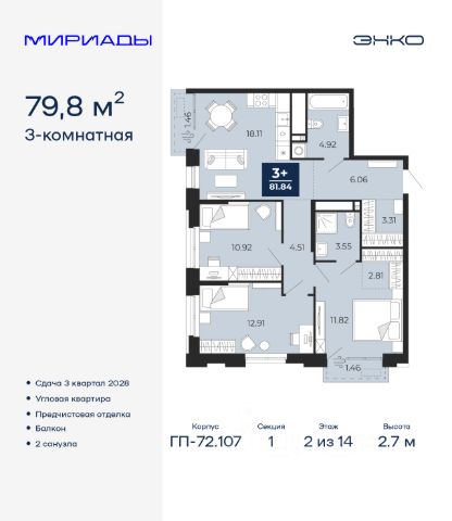 Спешите оформить бронирование по этой цене! Срок предложения ограничен! Стоимость квартиры указана со скидкой, ваша экономия составит 473,000 RUB. Звоните, мы вам все подробно расскажем! Трехкомнатная квартира от застройщика с предчистовой отделкой в ЖК "Мириады" на 2 этаже. Общая площадь: 76.46 кв.м., жилая: 31.31 кв.м., площадь просторной кухни-столовой: 24.59 кв.м. Угловая квартира, очень светлая, естественная вентиляция при открытии окон. В квартире одна лоджия, один совмещенный и один раздельный санузел. Высота потолков 2.7 м. Дом монолитный, черырехподъездный, переменной этажности, от 13 до 16 этажей. Квартира находится в 4-й секции высотой 16 этажей в корпусе ГП-72.106. На этаже 6 квартир. В подъезде 1 пассажирский и 1 грузовой лифт. Окончание строительства - 3 квартал 2028 года. Оформление сделки по договору долевого участия. Вселенная бесконечных историй. Ранее невиданный Тюмени масштаб: территория 240 гектаров и 1 650 000 м² застройки. Мириады это город масштабных перемен и больших возможностей. Город зеленых рощ и зеркальных озер. Город для работы, учебы и развлечений. Город для детей и их родителей. Город для всех и каждого. Проект расположен в районе Мыс рядом с ТРЦ "Тюмень Сити Молл" в границах улицы Тимофея Чаркова, Тобольского тракта и объездной дороги. Срок полного освоения территории - до 2034 года. #26DA4c