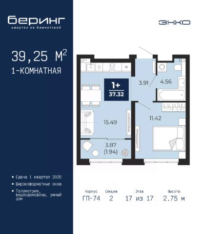 Однокомнатная квартира в ЖК "Беринг" на 2 этаже. Общая площадь: 37.55 кв.м. Высота потолков 2.72 м. Дом монолитный, многоподъездный, переменной этажности, от 17 до 24 этажей. Квартира находится в 8-й секции высотой 17 этажей в корпусе ГП-75. На этаже 8 квартир. В подъезде 2 пассажирских и 1 грузовой лифт. Окончание строительства - 4 квартал 2027 года. Оформление сделки по договору долевого участия. Подобно знаменитому исследователю, мы чувствуем себя первооткрывателями этой локации. Хотим показать новую суть места, сформировать для вас жизненный опыт, которого ещё не было. Беринг — район зелёного цвета. Беринг — район, который откроется вам с другой стороны. Впечатлит новым уровнем комфорта и качеством жизни. Беринг — открытие на карте города. Первый квартал расположен в районе Тура, в границах улиц: Камчатская Западносибирская Энтузиастов. Вокруг уже есть всё для того, чтобы ежедневная рутина была лишь частью жизни и не доставляла дискомфорта. Школы и детские сады, магазины и аптеки, поликлиника, места для семейного отдыха, пеших и велопрогулок, и даже рыбалки. Масштабное озеленение дворов — визитная карточка ЭНКО и ваш оазис спокойствия, чтобы отвлечься от повседневности. Раскидистые деревья, кустарники, травы и цветы — осталось остановиться, вдохнуть и расслабиться, глядя на эту природную красоту. Стилистика подъездов продолжает концепцию Беринга, вдохновлённого Камчаткой: сдержанный, но при этом впечатляющий дизайн соседствует с удобством и функциональностью. #Z6dDWl Продается квартира в микрорайоне Энтузиастов в городе Тюмень.