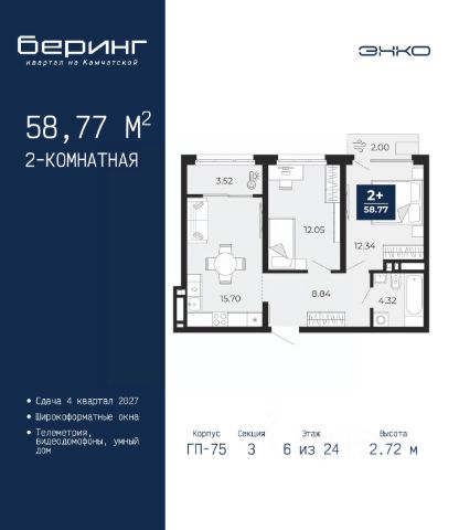 Однокомнатная квартира в ЖК "Беринг" на 2 этаже. Общая площадь: 37.55 кв.м. Высота потолков 2.72 м. Дом монолитный, многоподъездный, переменной этажности, от 17 до 24 этажей. Квартира находится в 8-й секции высотой 17 этажей в корпусе ГП-75. На этаже 8 квартир. В подъезде 2 пассажирских и 1 грузовой лифт. Окончание строительства - 4 квартал 2027 года. Оформление сделки по договору долевого участия. Подобно знаменитому исследователю, мы чувствуем себя первооткрывателями этой локации. Хотим показать новую суть места, сформировать для вас жизненный опыт, которого ещё не было. Беринг — район зелёного цвета. Беринг — район, который откроется вам с другой стороны. Впечатлит новым уровнем комфорта и качеством жизни. Беринг — открытие на карте города. Первый квартал расположен в районе Тура, в границах улиц: Камчатская Западносибирская Энтузиастов. Вокруг уже есть всё для того, чтобы ежедневная рутина была лишь частью жизни и не доставляла дискомфорта. Школы и детские сады, магазины и аптеки, поликлиника, места для семейного отдыха, пеших и велопрогулок, и даже рыбалки. Масштабное озеленение дворов — визитная карточка ЭНКО и ваш оазис спокойствия, чтобы отвлечься от повседневности. Раскидистые деревья, кустарники, травы и цветы — осталось остановиться, вдохнуть и расслабиться, глядя на эту природную красоту. Стилистика подъездов продолжает концепцию Беринга, вдохновлённого Камчаткой: сдержанный, но при этом впечатляющий дизайн соседствует с удобством и функциональностью. #Z6dDWl Продается квартира в микрорайоне Энтузиастов в городе Тюмень.