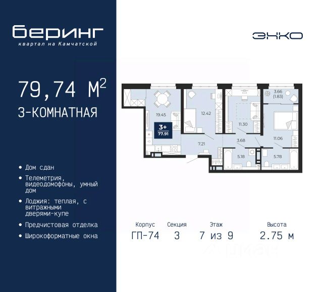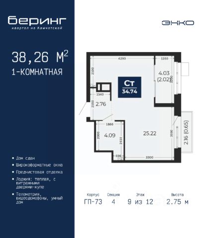 Спешите оформить бронирование по этой цене, предложение ограничено! Стоимость квартиры указана со скидкой, ваша экономия составит 561,371 руб. Звоните, наши менеджеры вам все расскажут. Продается 1-комн. квартира с предчистовой отделкой в ЖК "Беринг" на 9 этаже. Общая площадь: 38.26 кв.м., жилая: 12.95 кв.м., площадь просторной кухни-столовой: 15.48 кв.м. Все окна выходят на одну сторону. В квартире одна лоджия, один совмещенный санузел. Высота потолков 2.75 м. Дом монолитный, многоподъездный, переменной этажности, от 9 до 22 этажей. Квартира находится в 4-й секции высотой 12 этажей в корпусе ГП-73. На этаже 8 квартир. В подъезде 1 пассажирский и 1 грузовой лифт. В настоящее время строительство завершено, дом сдан в 1 квартале 2026 года. Оформление сделки по договору купли-продажи. Подобно знаменитому исследователю, мы чувствуем себя первооткрывателями этой локации. Хотим показать новую суть места, сформировать для вас жизненный опыт, которого ещё не было. Беринг — район зелёного цвета. Беринг — район, который откроется вам с другой стороны. Впечатлит новым уровнем комфорта и качеством жизни. Беринг — открытие на карте города. Первый квартал расположен в районе Тура, в границах улиц: Камчатская Западносибирская Энтузиастов. Вокруг уже есть всё для того, чтобы ежедневная рутина была лишь частью жизни и не доставляла дискомфорта. Школы и детские сады, магазины и аптеки, поликлиника, места для семейного отдыха, пеших и велопрогулок, и даже рыбалки. Масштабное озеленение дворов — визитная карточка ЭНКО и ваш оазис спокойствия, чтобы отвлечься от повседневности. Раскидистые деревья, кустарники, травы и цветы — осталось остановиться, вдохнуть и расслабиться, глядя на эту природную красоту. Стилистика подъездов продолжает концепцию Беринга, вдохновлённого Камчаткой: сдержанный, но при этом впечатляющий дизайн соседствует с удобством и функциональностью. #26dD9d Продается квартира в микрорайоне Энтузиастов в городе Тюмень.