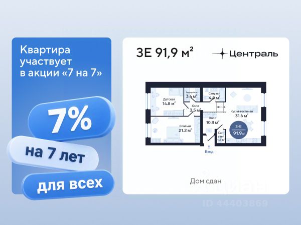 Условия покупки для этой квартиры: Cтавка 7% для всех. Срок ставки 7 лет. Ежемесячный платеж 73 172 руб. в месяц. Первоначальный взнос 20% или 2 751 289 руб Евротрехкомнатная квартира площадью 91,9 м² Планировка правильной формы — в такой удобно расположены комнаты, больше возможностей для зонирования пространства и легче поставить мебель. В просторной кухне-гостиной два окна и высокий потолок — 3,2 метра. В спальне и детской сделаны ниши для шкафов, чтобы свободного места в комнатах было больше. Дополнительное хранение можно организовать в гардеробной. В квартире выполнена предчистовая отделка, поэтому ремонт пройдёт проще и быстрее. Стены выровнены и оштукатурены, пол готов к финишному покрытию. Установлены входная сейф-дверь, пластиковые окна, розетки и выключатели. Квартал построен в районе ул. Максима Горького. Все дома сданы. В паре минут — набережная и пруд с парящим променадом. Вся инфраструктура для жизни тоже близко: школы, детские сады, бассейн, гипермаркет и торговый центр в радиусе 10 минут пешком. В квартале зелёные дворы без машин: здесь безопасно играть детям и комфортно отдыхать взрослым. Для автомобилей рядом с кварталом строится многоуровневый паркинг. Для безопасности по периметру домов работает видеонаблюдение. ЖК построил ПСК Дом девелопмент — застройщик с фокусом на развитие Тюмени с 26-летним опытом на рынке недвижимости. Способы покупки: — ипотечные программы — обмен вашего жилья на новую квартиру — дистанционная покупка — рассрочка Узнать дополнительную информацию и записаться на встречу в офисе продаж можно по номеру, указанному в объявлении. Купить квартиру в микрорайоне Харьковская (Центральный) в городе Тюмень.