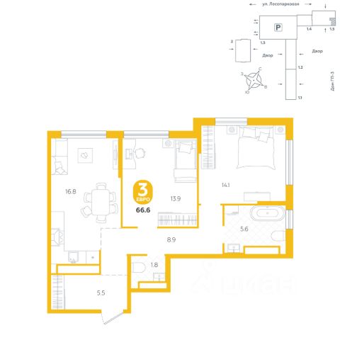 Квартира располагается в ГК "Чистые Пруды" от "Паритет девелопмент". Это флагманский проект компании в Тюмени. Расположение вдали от шумных улиц и оживленного центра создает ощущение жизни на природе и окружает тишиной и спокойствием. Есть вся необходимая социальная и коммерческая инфраструктура: магазины и сфера услуг на первых этажах. Школы, сады, поликлиника, парки в шаговой доступности. Квартал строится в районе Новой Лесобазы. Рядом выезд на объездную, что существенно экономит время. Поездка до центра города на автомобиле занимает 15-20 минут. Городские кварталы "Чистые Пруды" сформирован из домов переменной этажности и многоуровневых паркингов. Ввод 1 очереди строительства запланирован на II кв. 2028 года. Всё благоустройство квартала представлено двумя функциональными зонами: приватная внутри дворовая и общественная. Каждый закрытый двор имеет выход на единую променадную зону - бульвар. Концепция благоустройства основана на принципе модульности, что формирует основную идею приватности. Приватность проекта подчеркивает его особенный климат внутри. Модульное благоустройство позволит максимально эффективно использовать пространство двора и удовлетворить потребности различных категорий жителей. В квартирах базово выполнена улучшенная черновая отделка, которая включает в себя: выровненные стены, стяжка пола с шумоизоляцией, горизонтальная разводка отопления, установлены счетчики с телеметрией, окна с 5-камерным профилем и надежные входные двери. При желании можно добавить ремонт от застройщика и включить его в стоимость ипотеки, что позволит сэкономить на стройматериалах и переехать сразу после получения ключей. Характеристики квартиры: этаж - 2 количество комнат - 3 номер помещения - 280 площадь квартиры - 64,9 кв.мГармоничные пропорции и большие окна наполняют пространство светом, создавая уютную атмосферу. Умное зонирование позволяет удобно организовать как рабочую, так и жилую зоны, что особенно важно для современных жителей. Санузел спроектирован с учетом всех потребностей: здесь есть ванна и место для стиральной машины. Каждый метр квартиры используется с максимальной эффективностью, что делает эту планировку отличным выбором для тех, кто ценит комфорт и удобство. Купить квартиру в микрорайоне Казачьи Луга в городе Тюмень.