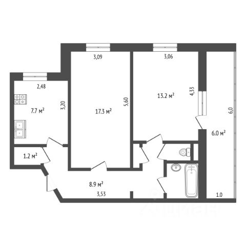 Удобная спальня 12,3 м², раздельный санузел.