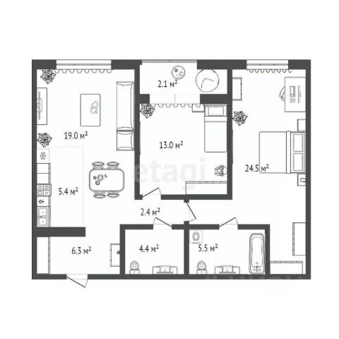 кухня -гостиная 48,9 кв.м., спальная комната 16,6 кв.м., мастер спальня 21 кв.м., кабинет 11 кв.м., сауна 3 кв.м., гардеробная 6,2 кв.м, душевая 1.5 кв.м, с/у постирочная 9 кв.м., ванная 5,3 кв.м.