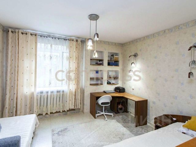 В квартире остаются все необходимые для комфортной жизни вещи: кухонный гарнитур с посудомоечной машиной, барная стойка со стульями, диван, встроенный шкаф, детская кровать, стеллаж и комод.