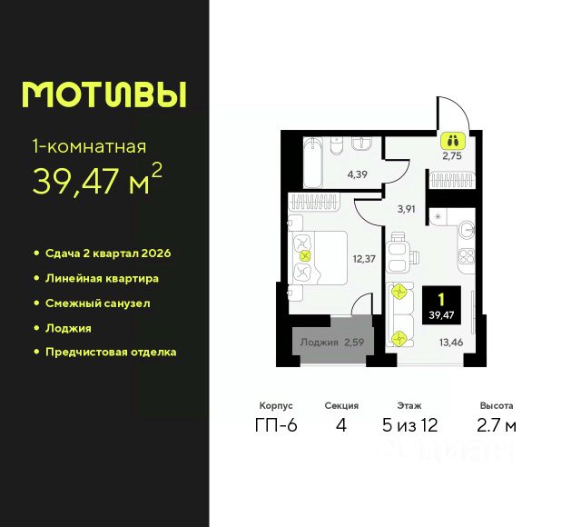 Просторная 1-комн. квартира с первичной отделкой в ЖК "Мотивы" на 8 этаже. Общая площадь: 37.45 кв.м., жилая: 12.01 кв.м., площадь просторной кухни-столовой: 15.83 кв.м. Все окна выходят на одну сторону. В квартире одна лоджия, один совмещенный санузел. Высота потолков 2.7 м. Квартира предоставляется в чистовой отделке: на полу ламинат, на стенах флизелиновые обои под покраску, санузел отделан плиткой, установлена вся сантехника, краны, смесители, душевые лейки и т.д., также в комплектацию входит кондиционер, видеодомофон, вызывная панель домофона уже установлена и подключена к работе. Выбирая место для жизни, вы хотите, чтобы оно было лучше и удобнее. Мы же хотим, чтобы каждый смог получить все, что пожелает при переезде в новый дом. Это наша цель, миссия и главный мотив. Пара шагов от дома и вы оказываетесь в парке, где можно совершить утреннюю пробежку или неспешно прогуляться после рабочего дня. Подъезды в домах сквозные, а входные группы расположены на уровне тротуара - в дом удобно заходить как с улицы, так и со двора. Домофон в тёплом тамбуре не позволит вам замёрзнуть, пока вы открываете двери. А хорошее настроение обеспечат светлые холлы, оформленные в едином стиле. Больше никакой грязи в квартире. Велосипеды и коляски можно оставить в колясочных, которые мы сделали по-настоящему просторными. А обладатели четверногих друзей смогут помыть их лапки после прогулки в специально оборудованных лапомойных комнатах. Квартира с видом на бескрайний природный простор или на урбанистический пейзаж? Легко! Мы создали безопасный двор, где можно без лишних тревог оставить детей играть во дворе. Закрытая от автомобилей территория и камеры видеонаблюдения - гарант вашего спокойствия. #zWdUTv