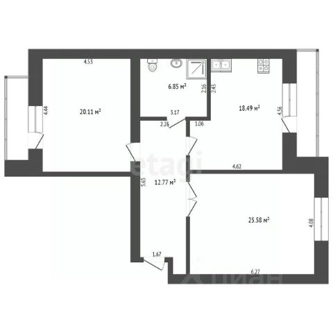 Площадь: Общая 84,1 м². Просторная кухня-столовая 18,5 м², гостиная 25,6 м², спальня 20,1 м².