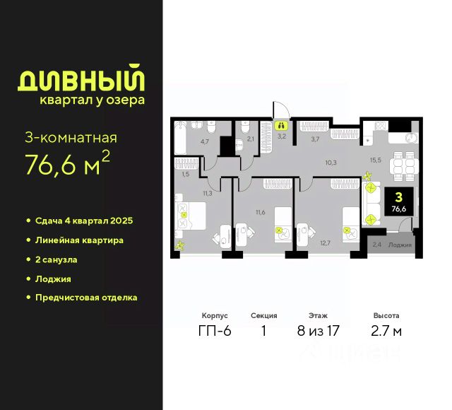 Продается 3-комн. квартира от застройщика в ЖК "Дивный квартал у озера" на 7 этаже. Общая площадь: 90.2 кв.м. Высота потолков 2.7 м. Дом монолитный, трехподъездный, переменной этажности, от 9 до 17 этажей. Квартира находится во 2-й секции высотой 17 этажей в корпусе ГП-6. На этаже 5 квартир. В подъезде 1 пассажирский и 1 грузовой лифт. Окончание строительства - 4 квартал 2025 года. Оформление сделки по договору долевого участия. "Дивный квартал у озера" современный жилой квартал, удобно расположенный в 10-ти минутах от центра Тюмени, в уютном районе рядом с зеленым массивом и озером Алебашево. Комплекс находится между улицами Мельникайте и Алебашевская, что обеспечивает его хорошую транспортную доступность до центра на автомобиле всего 10 минут. Рядом с комплексом расположен Лесопарк имени Гагарина, экзотический Парк дружбы между Россией и Республикой Корея. "Дивный квартал у озера" объединяет архитектуру современной городской застройки и природную эстетику. Уютные дворы жилого комплекса будут не только безопасными, но и тихими. Закрытая территория надёжно защищена от шума и посторонних глаз. Здесь будут места для отдыха, детские площадки, зоны для выгула собак. В холлах первого этажа расположены мягкая зона ожидания, общественные санузлы и просторная колясочная. Квартал будет располагать богатой инфраструктурой: на первых этажах домов разместятся магазины, пекарни, кофейни, пункты выдачи, аптеки, детские центры, цветочные салоны и многое другое, что сделает жизнь поистине комфортной. В комплексе есть теплый подземный паркинг и кладовые. #Zma4dg