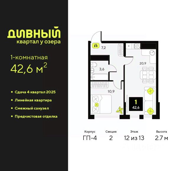 2-комн. квартира с предчистовой отделкой в ЖК "Дивный квартал у озера" на 2 этаже. Общая площадь: 57.1 кв.м., жилая: 22.8 кв.м., площадь просторной кухни-столовой: 15 кв.м. Угловая квартира, идеально подойдет любителям тишины и панорамных видов. В квартире две лоджии, два совмещенных санузла. Высота потолков 2.7 м. Квартира будет сдаваться с предчистовой отделкой White Box: выровнены и оштукатурены стены, проведено электричество и отопление, установлены радиаторы. Вы также можете приобрести квартиру с ремонтом от застройщика, представленным в трех цветовых решениях Scandi, Wood и Coffee и включающим: ламинат, обои под покраску, двери, натяжной потолок, санузел с сантехникой. При желании вы можете заказать отделку под ключ, варианты возможных решений представлены в альбоме фотографий. Дом монолитный, трехподъездный, переменной этажности, от 9 до 17 этажей. Квартира находится в 1-й секции высотой 17 этажей в корпусе ГП-6. На этаже 8 квартир. В подъезде 1 пассажирский и 1 грузовой лифт. Окончание строительства - 4 квартал 2025 года. Оформление сделки по договору долевого участия. "Дивный квартал у озера" современный жилой квартал, удобно расположенный в 10-ти минутах от центра Тюмени, в уютном районе рядом с зеленым массивом и озером Алебашево. Комплекс находится между улицами Мельникайте и Алебашевская, что обеспечивает его хорошую транспортную доступность до центра на автомобиле всего 10 минут. Рядом с комплексом расположен Лесопарк имени Гагарина, экзотический Парк дружбы между Россией и Республикой Корея. "Дивный квартал у озера" объединяет архитектуру современной городской застройки и природную эстетику. Уютные дворы жилого комплекса будут не только безопасными, но и тихими. Закрытая территория надёжно защищена от шума и посторонних глаз. Здесь будут места для отдыха, детские площадки, зоны для выгула собак. В холлах первого этажа расположены мягкая зона ожидания, общественные санузлы и просторная колясочная. Квартал будет располагать богатой инфраструктурой: на первых этажах домов разместятся магазины, пекарни, кофейни, пункты выдачи, аптеки, детские центры, цветочные салоны и многое другое, что сделает жизнь поистине комфортной. В комплексе есть теплый подземный паркинг и кладовые. #z69aDw