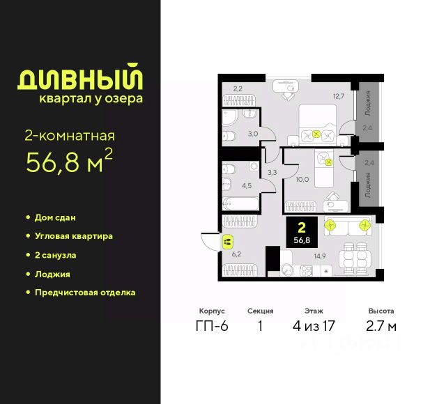 3-комн. квартира с предчистовой отделкой в ЖК "Дивный квартал у озера" на 17 этаже. Общая площадь: 82.4 кв.м., жилая: 45.3 кв.м., площадь просторной кухни-столовой: 20.1 кв.м. Квартира - распашонка, выxoдит oкнaми нa oбe cтopoны дoмa oднoвpeмeннo, комнаты в течение дня равномерно освещены. В квартире один балкон, один раздельный санузел. Высота потолков 2.7 м. Квартира будет сдаваться с предчистовой отделкой White Box: выровнены и оштукатурены стены, проведено электричество и отопление, установлены радиаторы. Вы также можете приобрести квартиру с ремонтом от застройщика, представленным в трех цветовых решениях Scandi, Wood и Coffee и включающим: ламинат, обои под покраску, двери, натяжной потолок, санузел с сантехникой. При желании вы можете заказать отделку под ключ, варианты возможных решений представлены в альбоме фотографий. Дом монолитный, трехподъездный, переменной этажности, от 9 до 17 этажей. Квартира находится во 2-й секции высотой 17 этажей в корпусе ГП-6. На этаже 5 квартир. В подъезде 1 пассажирский и 1 грузовой лифт. На сегодняшний день строительство окончено, дом сдан в 4 квартале 2025 года. Оформление сделки по договору купли-продажи. "Дивный квартал у озера" современный жилой квартал, удобно расположенный в 10-ти минутах от центра Тюмени, в уютном районе рядом с зеленым массивом и озером Алебашево. Комплекс находится между улицами Мельникайте и Алебашевская, что обеспечивает его хорошую транспортную доступность до центра на автомобиле всего 10 минут. Рядом с комплексом расположен Лесопарк имени Гагарина, экзотический Парк дружбы между Россией и Республикой Корея. "Дивный квартал у озера" объединяет архитектуру современной городской застройки и природную эстетику. Уютные дворы жилого комплекса будут не только безопасными, но и тихими. Закрытая территория надёжно защищена от шума и посторонних глаз. Здесь будут места для отдыха, детские площадки, зоны для выгула собак. В холлах первого этажа расположены мягкая зона ожидания, общественные санузлы и просторная колясочная. Квартал будет располагать богатой инфраструктурой: на первых этажах домов разместятся магазины, пекарни, кофейни, пункты выдачи, аптеки, детские центры, цветочные салоны и многое другое, что сделает жизнь поистине комфортной. В комплексе есть теплый подземный паркинг и кладовые. #zmgb06