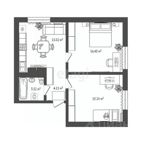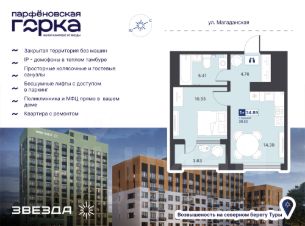 Планировка: просторная кухня-гостиная, отдельная спальня с гардеробной, сантехника и отделка высокого качества. В ремонте использованы современные износостойкие материалы. Квартира полностью укомплектована мебелью и техникой: встроенная кухня, столовая зона, диван-кровать, шкаф-гардероб, стиральная машина, холодильник, плита, вытяжка. Подходит для тех, кто хочет въехать сразу без дополнительных вложений.