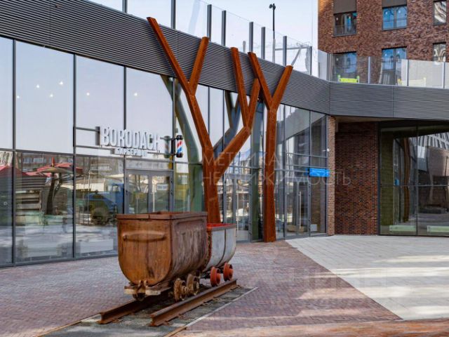Квартал бизнес-класса, в котором видно сочетание высотности, строгих форм, стекла, кирпича, металла и натуральных материалов, мотивов ветвей дерева, многоуровневого ландшафтного дизайна.