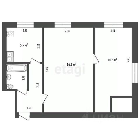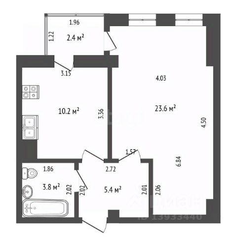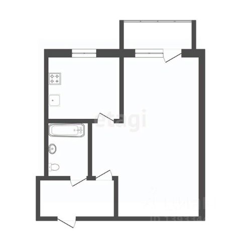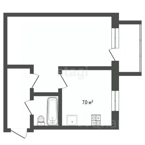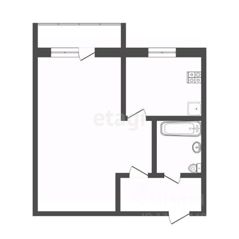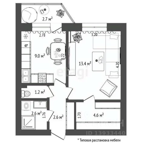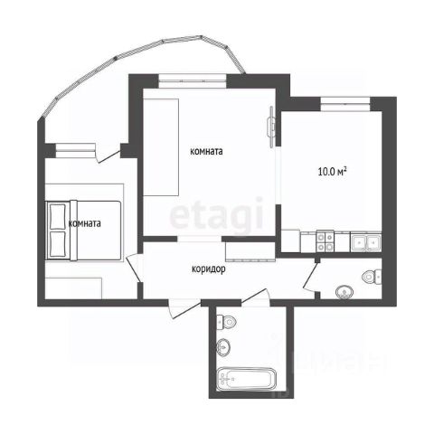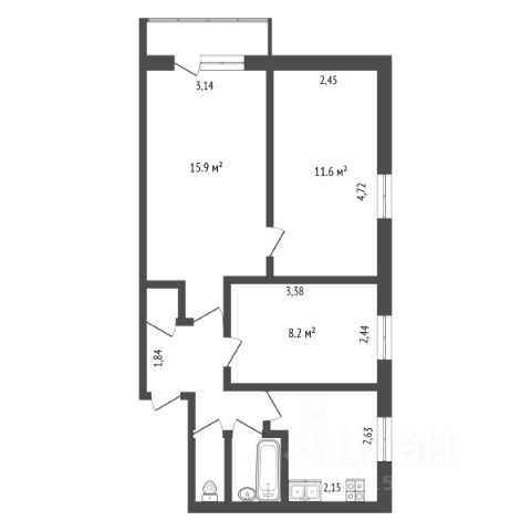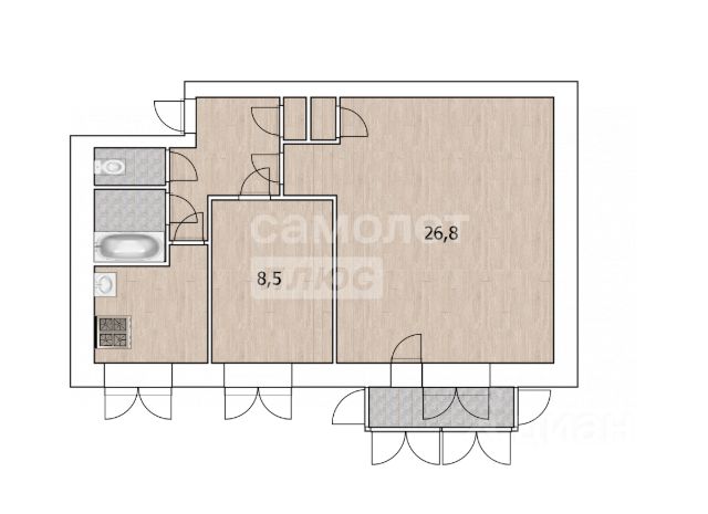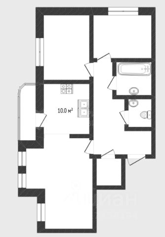 Планировка квартиры включает кухню, соединенную с гостиной, две спальни, одна из которых может быть детской комнатой, а также прихожую с гардеробной, раздельный санузел и лоджию (на кухне).