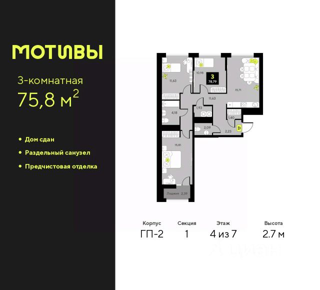1-комн. квартира от застройщика с предчистовой отделкой в ЖК "Мотивы" на 12 этаже. Общая площадь: 34.8 кв.м., жилая: 12.4 кв.м., площадь просторной кухни-столовой: 14.5 кв.м. Все окна выходят на одну сторону. В квартире одна лоджия, один совмещенный санузел. Высота потолков 2.7 м. Квартира будет сдаваться с предчистовой отделкой White Box: выровнены и оштукатурены стены, проведено электричество и отопление, установлены радиаторы. Вы также можете приобрести квартиру с ремонтом от застройщика, представленным в трех цветовых решениях Scandi, Wood и Coffee и включающим ламинат, обои под покраску, двери, натяжной потолок и санузел с сантехникой. При желании вы можете заказать отделку под ключ, варианты возможных решений представлены в альбоме фотографий. Дом монолитный, двухподъездный, переменной этажности, от 12 до 14 этажей. Квартира находится во 2-й секции высотой 12 этажей в корпусе ГП-1. На этаже 12 квартир. В подъезде 1 пассажирский и 1 грузовой лифт. В настоящее время строительство окончено, дом сдан в 4 квартале 2024 года. Оформление сделки по договору купли-продажи. Закрытая от автомобилей территория, безопасный двор и камеры видеонаблюдения - гаранты вашего спокойствия. Квартал будет располагать богатой инфраструктурой: на первых этажах разместятся магазины, пекарни, кофейни, пункты выдачи, аптеки, детские центры, цветочные салоны и многое другое, что сделает жизнь поистине комфортной. Рядом находится парк общей площадью почти 5000 м², в котором располагаются локации для игр и отдыха жителей, здесь можно совершить утреннюю пробежку или прогуляться после рабочего дня. В парке есть зона воркаута с тренажерами для взрослых, игровые комплексы с горками и канатный комплекс для детей разных возрастов, качели и лавочки для отдыха, площадки для командных видов спорта и для панна-футбола. В ЖК "Мотивы" всё продумано до мелочей: светлые холлы входных групп, оформленные в едином стиле, просторные колясочные, лапомойки для питомцев. На территории комплекса находятся 2 8-ми этажных паркинга и более 1000 м/м на открытой парковке. Жилой комплекс находится в одном из экологически благоприятных районов Тюмени, недалеко от Плехановского бора. При этом до центра города можно добраться за 15 минут, а до международного аэропорта Рощино за 13 минут. Окончание строительства: ГП 1, 2, 3, 4 сдача до конца 2024 года, ГП 6, 7, 8 сдача 2 квартал 2026 года. #ZMdWtz