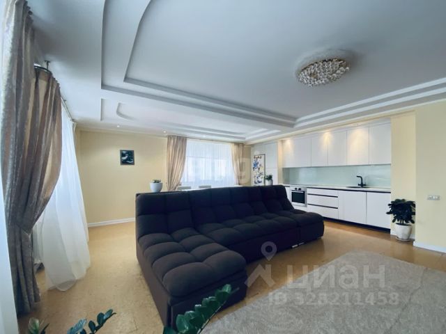 Просторная кухня правильной формы, гостиная 17, м² с окнами на две стороны и выходом на лоджию.