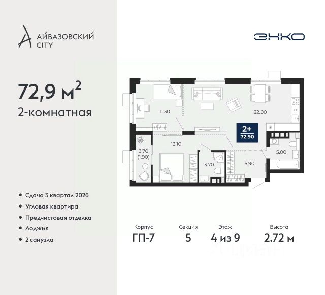 Трехкомнатная квартира от застройщика в ЖК "Айвазовский City" на 2 этаже. Квартира без отделки, новый собственник может сделать ремонт по своему дизайн-проекту. Общая площадь: 113.11 кв.м., жилая: 50 кв.м., площадь просторной кухни-столовой: 31.74 кв.м. Квартира угловая, идеально подойдет любителям тишины и панорамных видов. В квартире две лоджии, три совмещенных санузла. Высота потолков 2.72 м. Дом монолитный, многоподъездный, переменной этажности, от 9 до 24 этажей. Квартира находится в 5-й секции высотой 9 этажей в корпусе ГП-4. На этаже 4 квартиры. В подъезде 1 пассажирский и 1 грузовой лифт. Строительство окончено, дом сдан в 4 квартале 2023 года. Оформление сделки по договору купли-продажи. Новый жилой район располагается в живописном месте на берегу Туры в центральной части города. Принципиально новое пространство для жизни в центре современного города для тех, чьи мечты сбываются, кто нацелен на постоянный рост, перемены к лучшему для себя и своих близких. Каждая деталь Айвазовский City вдохновляет и заряжает на новые свершения: авторская архитектура, сбалансированная продуманная инфраструктура, дизайнерские дворы со спортивными и детскими площадками, парковые зоны с фонтанами, водный канал, украшающий центральный прогулочный маршрут района и многое другое. В 2019 года проект стал лауреатом престижной премии Urban Awards 2019 в номинации "Лучший строящийся региональный жилой комплекс бизнес-класса". Главная особенность Айвазовский City - соседство разных архитектурных школ в рамках одного дома. Изысканная классика, выразительная эклектика и оригинальный модерн - жить в одном из таких домов настоящий повод для гордости. Айвазовский City это идеальное сочетание комфорта, технологий и развитой инфраструктуры. Вход в подъезд возможен с улицы и со двора. Отправляясь на работу или за покупками, жители могут выйти с внешней стороны дома, а для прогулки с ребенком со стороны двора. Экологически чистые материалы и энергосберегающие технологии, качественное освещение общественных зон, видеонаблюдение по всей территории жилого района (в том числе в подъездах, лифтах и в подземном паркинге), закрытые дворы с доступом только для жителей Айвазовский City. Часть домов в Айвазовский City будут оснащены подземным паркингом. Востребованный в нашем климатическом поясе формат хранения автомобилей защитит собственность владельца в любое время года. Аккредитация в банках: ПАО Банк "ВТБ", ОАО "Альфа-Банк", ПАО "Газпромбанк", "Сбербанк России", ПАО "Совкомбанк" и других. #IfTA0d Купить квартиру на улице Пожарных и Спасателей в городе Тюмень.