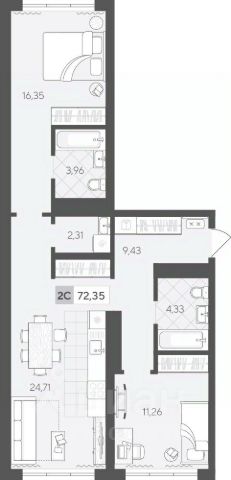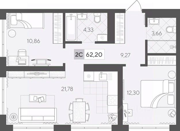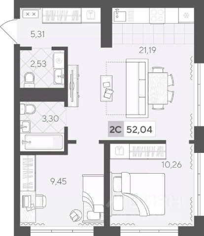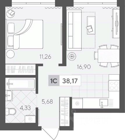 Внутреннее пространство квартиры включает просторную кухню-гостиную площадью 18,6 квадратных метров, где можно проводить