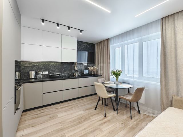 Изюминкой квартиры является кухня-гостиная, площадью 30 кв.м., в которой свободно разместились зона готовки, обеденная зона, зона отдыха!