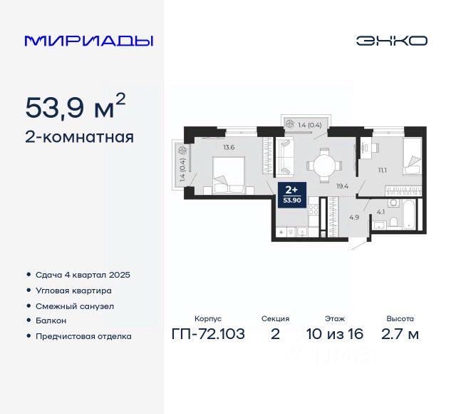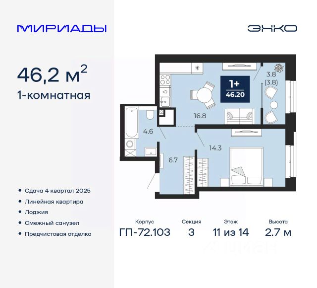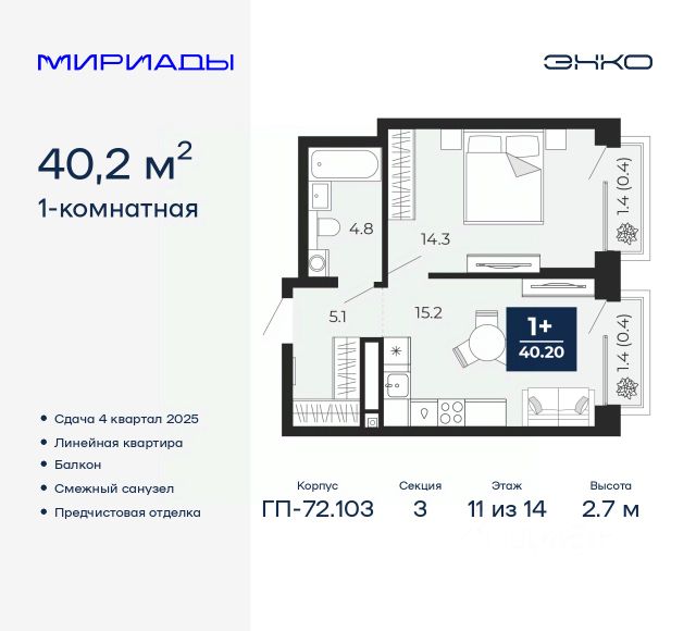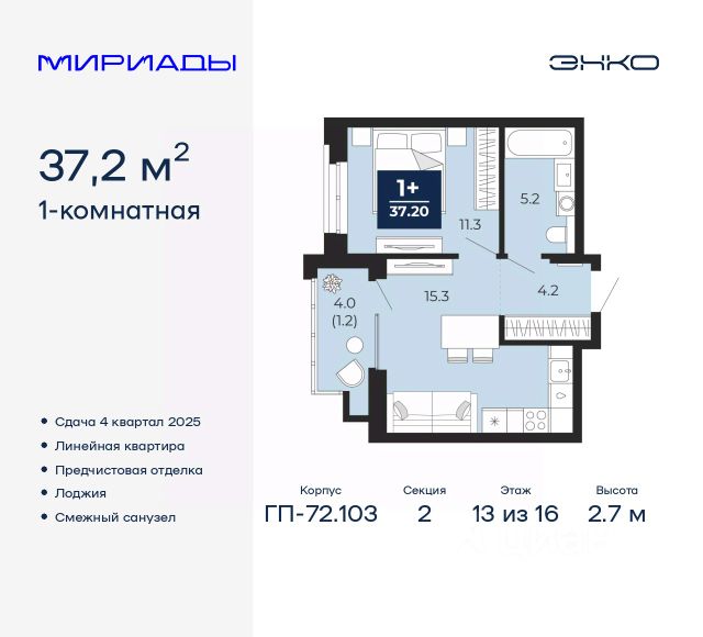 Однокомнатная квартира от застройщика с предчистовой отделкой в ЖК "Мириады" на 5 этаже. Общая площадь: 39 кв.м., жилая: 11.7 кв.м., площадь просторной кухни-столовой: 17.7 кв.м. Все окна выходят на одну сторону. В квартире один балкон, один совмещенный санузел. Высота потолков 2.7 м. Дом монолитный, трехподъездный, переменной этажности, от 14 до 16 этажей. Квартира находится в 3-й секции высотой 14 этажей в корпусе ГП-72.103. На этаже 8 квартир. В подъезде 1 пассажирский и 1 грузовой лифт. Окончание строительства - 4 квартал 2025 года. Оформление сделки по договору долевого участия. Вселенная бесконечных историй. Ранее невиданный Тюмени масштаб: территория 240 гектаров и 1 650 000 м² застройки. Мириады это город масштабных перемен и больших возможностей. Город зеленых рощ и зеркальных озер. Город для работы, учебы и развлечений. Город для детей и их родителей. Город для всех и каждого. Проект расположен в районе Мыс рядом с ТРЦ "Тюмень Сити Молл" в границах улицы Тимофея Чаркова, Тобольского тракта и объездной дороги. Срок полного освоения территории - до 2034 года. #26TDEe Купить квартиру на улице Тимофея Чаркова в городе Тюмень.