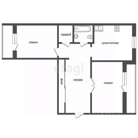 Планировка квартиры включает кухню, соединенную с гостиной, две спальни, одна из которых может быть детской комнатой, а также прихожую с гардеробной, разде