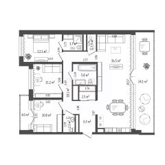 Сердце этой квартиры - Просторная Кухня-гостиная 36 кв.м. с широким панорамным остеклением создает эффект воздуха, света и свободы.
